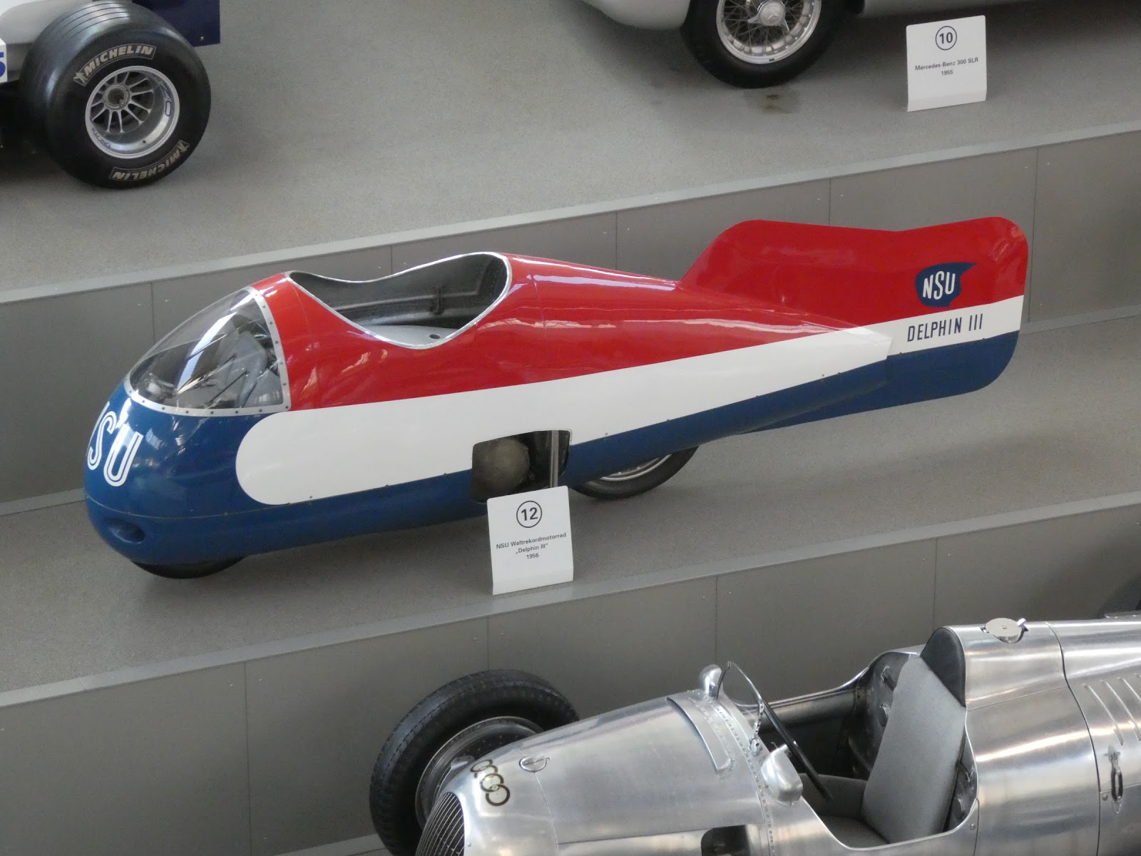 Looking down on the Messerschmitt racer, Auto-Union Type C 'Silver Arrow' and the NSU Delphine.